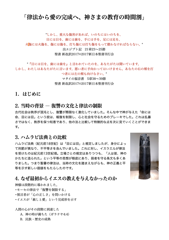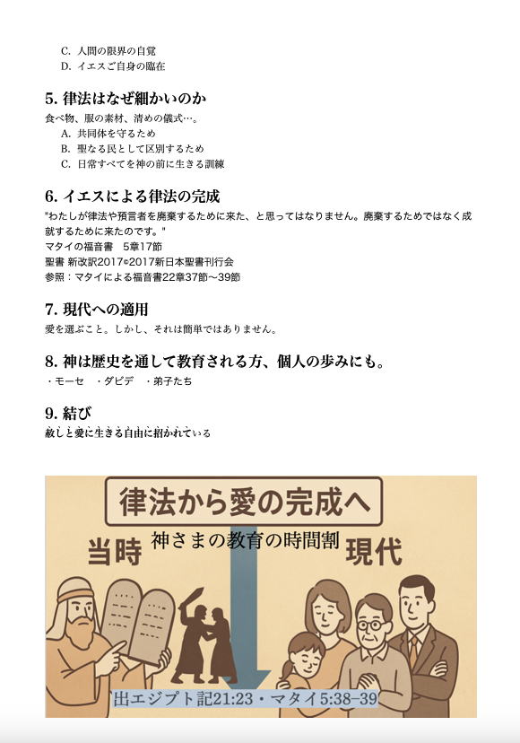 今回は「律法から愛の完成へ、神さまの教育の時間割」と題して、膨大な歴史の流れの中で、