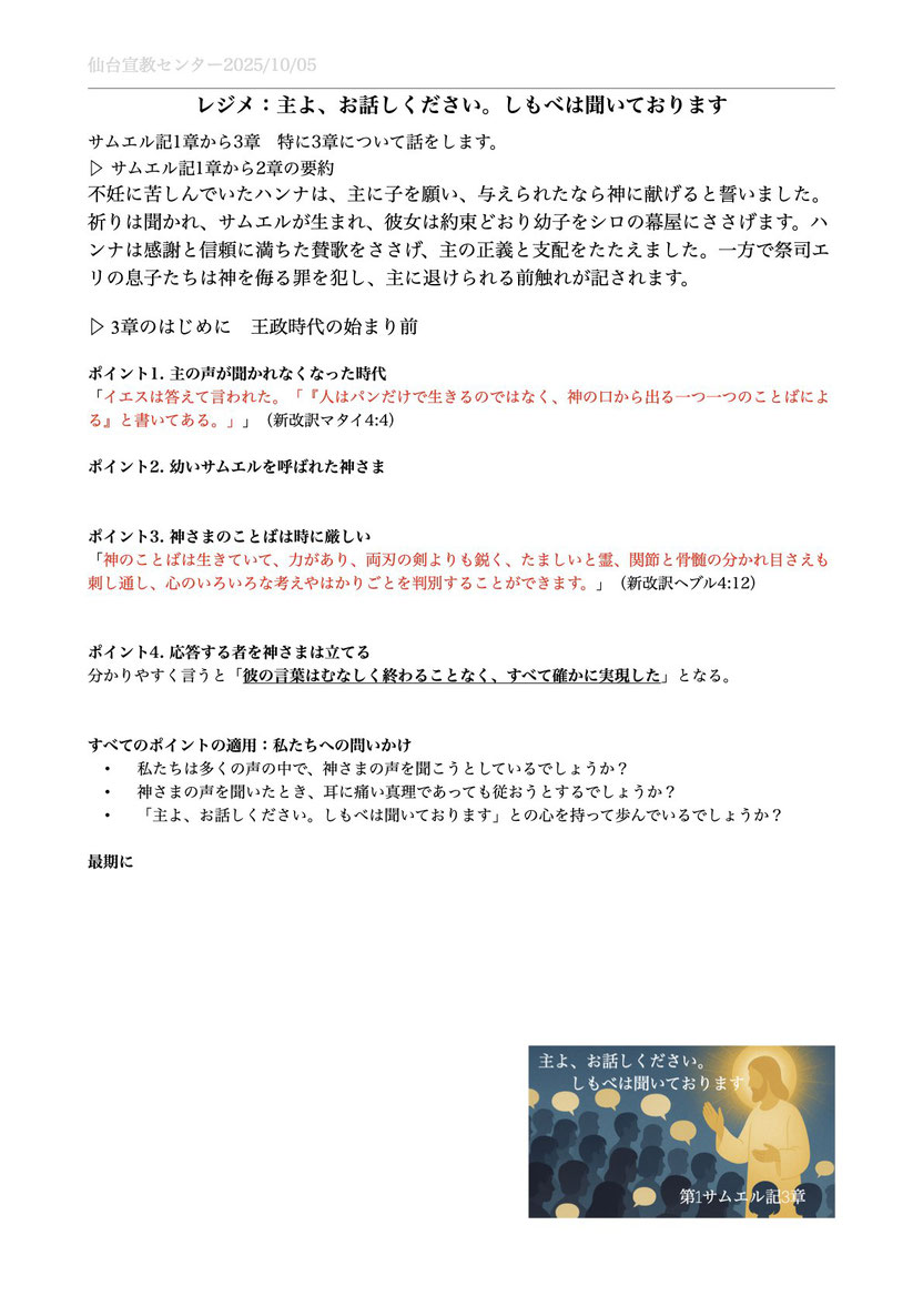 午前10時より、聖書から「主よ、お話しください。しもべは聞いております。」(サムエル記第一 3章9節)をテーマにご一緒に分かち合いたいと思います。
